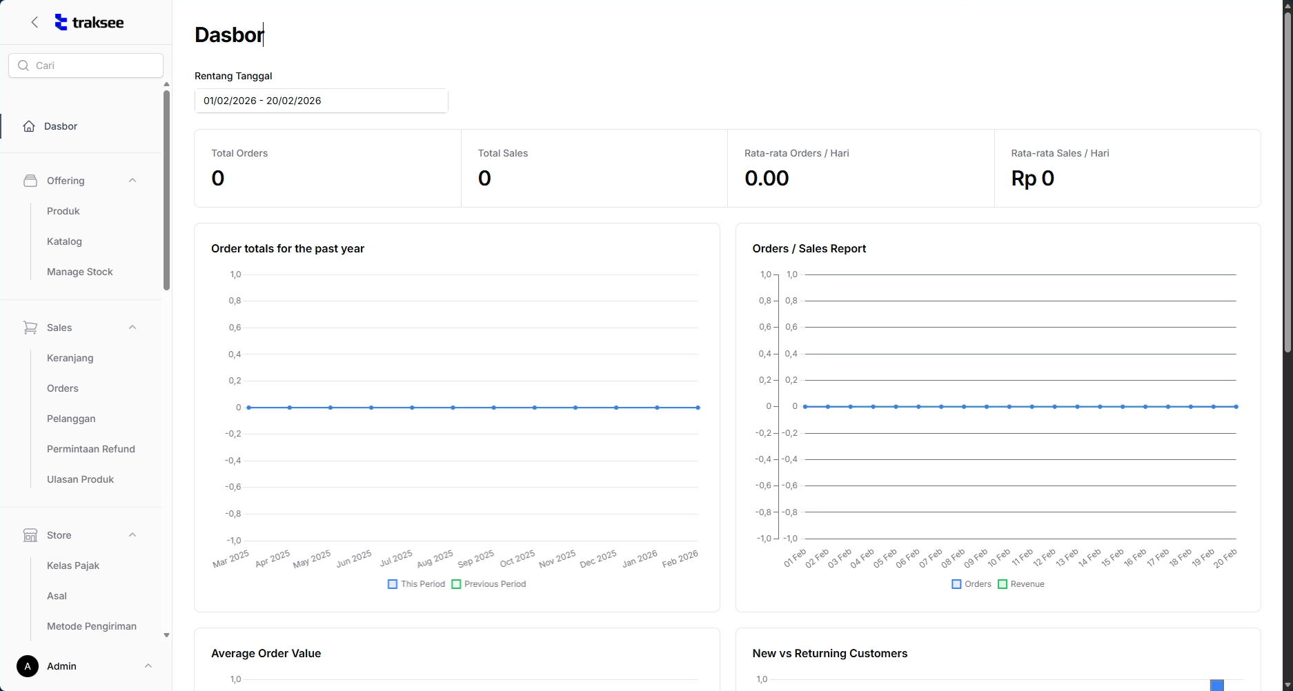 Dasbor adalah halaman utama yang ditampilkan setelah pengguna berhasil login. Fitur ini berfungsi sebagai pusat navigasi dan monitoring awal, menyediakan akses cepat ke modul-modul penting seperti produk dan pesanan, serta menampilkan ringkasan aktivitas terkini melalui link akses cepat seperti "Latest Orders".