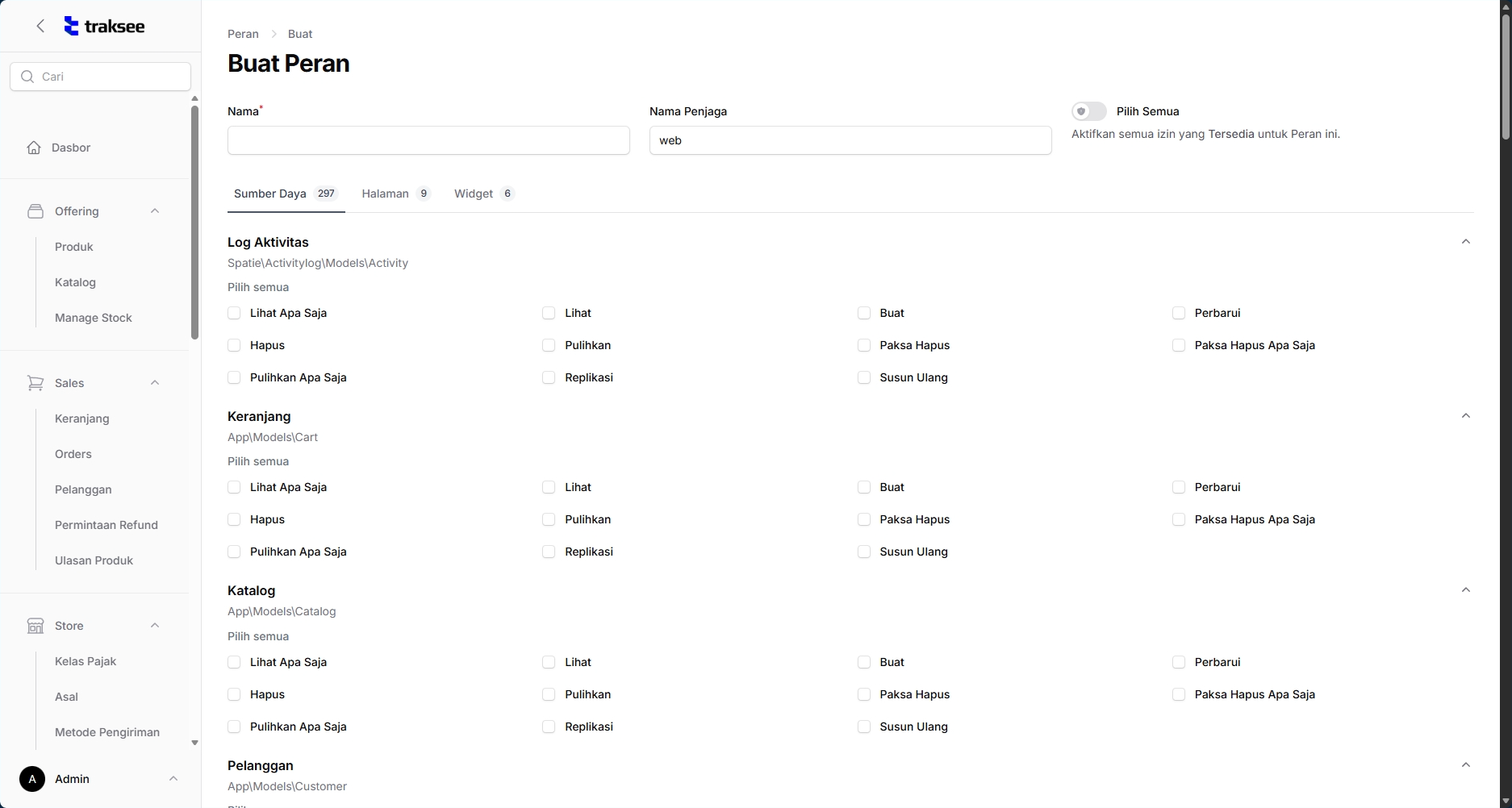 Fitur untuk mengatur hak akses dan wewenang (Role & Permission) setiap pengguna admin.