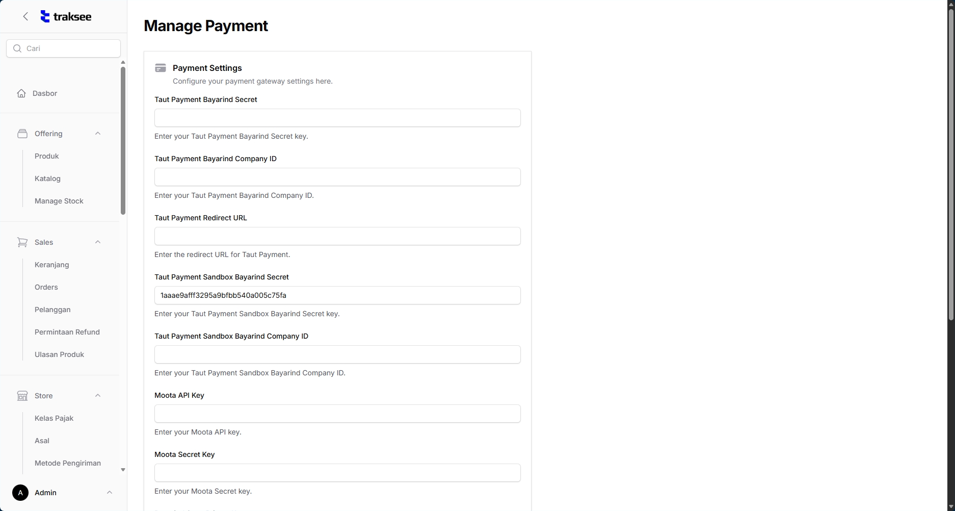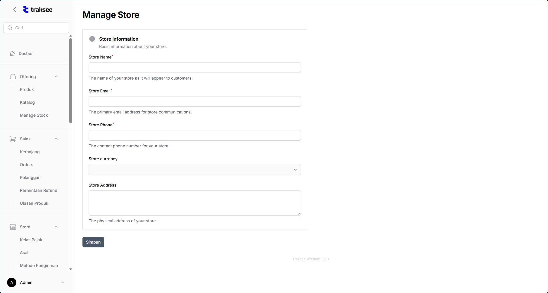 Modul Settings menyediakan pengaturan teknis dan tampilan toko. Modul ini mencakup konfigurasi umum toko, manajemen peran pengguna, kustomisasi tema, pengaturan SEO global, integrasi analitik dan pembayaran, serta konfigurasi template email.