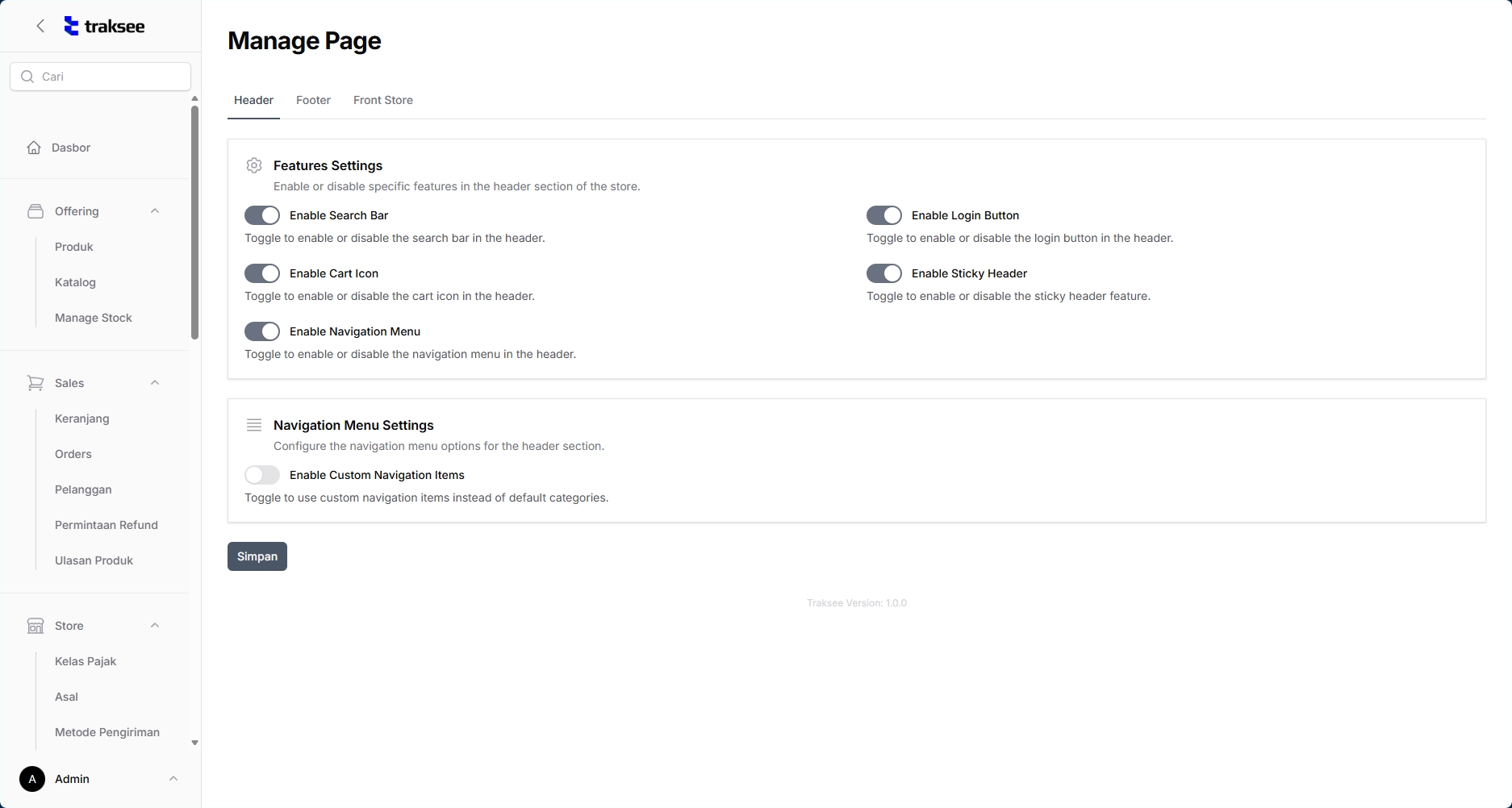 Fitur untuk mengatur tampilan struktur halaman toko seperti Header dan Footer.