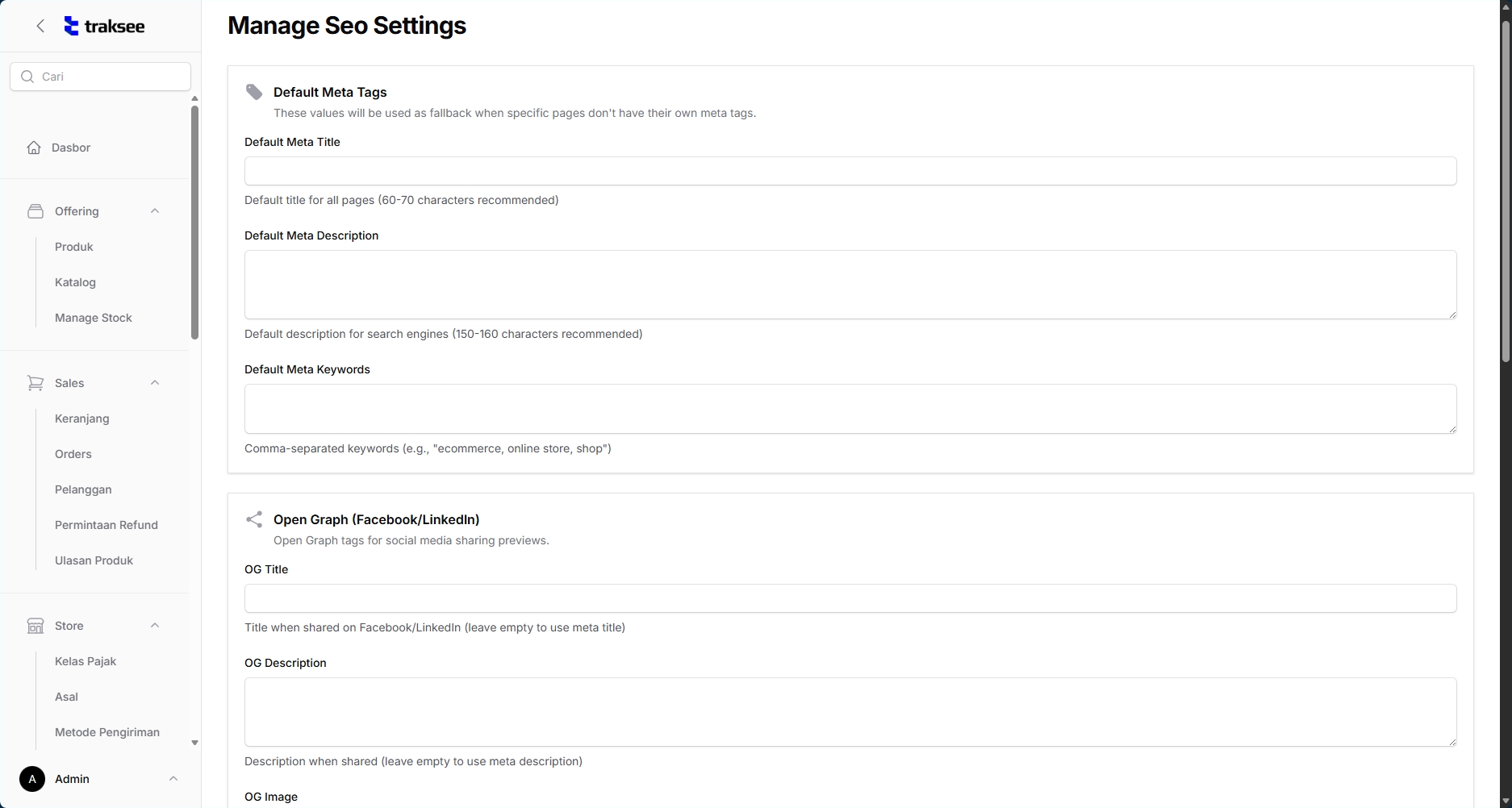 Fitur pengaturan SEO global untuk seluruh halaman toko, termasuk integrasi sosial media seperti Twitter Card.
