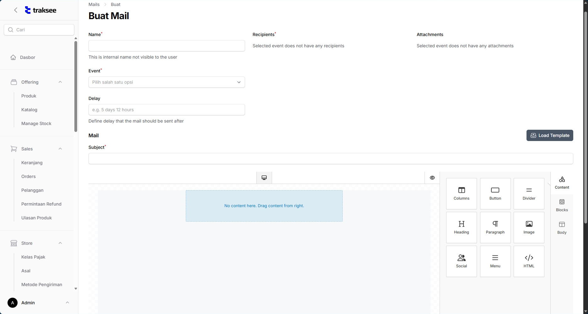 Fitur untuk membuat dan mengelola template email otomatis yang akan dikirim kepada pelanggan berdasarkan event tertentu.